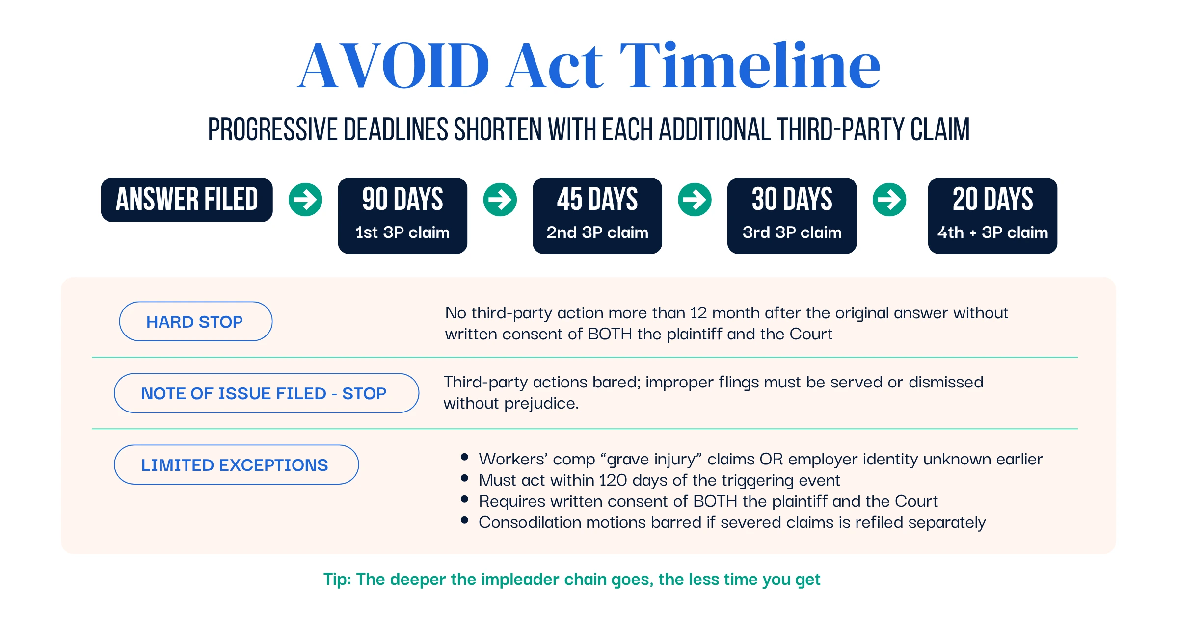 The AVOID Act is a New York law that requires third-party claims to be filed within strict deadlines—starting at just 90 days—forcing earlier identification of liability and eliminating delays in litigation.
